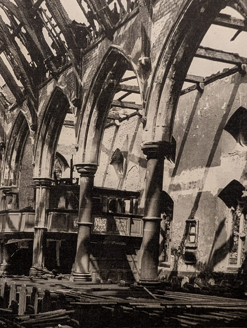 The Second World War brought disaster. At midnight on 21 September 1940 the church was hit by an incendiary bomb. The roof quickly caught alight and the fire rapidly spread from the west to the east of the church. The blaze only lasted a few hours but when it was over the interior was completely destroyed. Five days later the church was again hit, this time by a high explosive bomb which fell in the chancel. The reredos, the fine Willis organ and the high altar frontals were destroyed, though the vestments and the registers, and most of the contents of the vestry, were saved (see photo below).